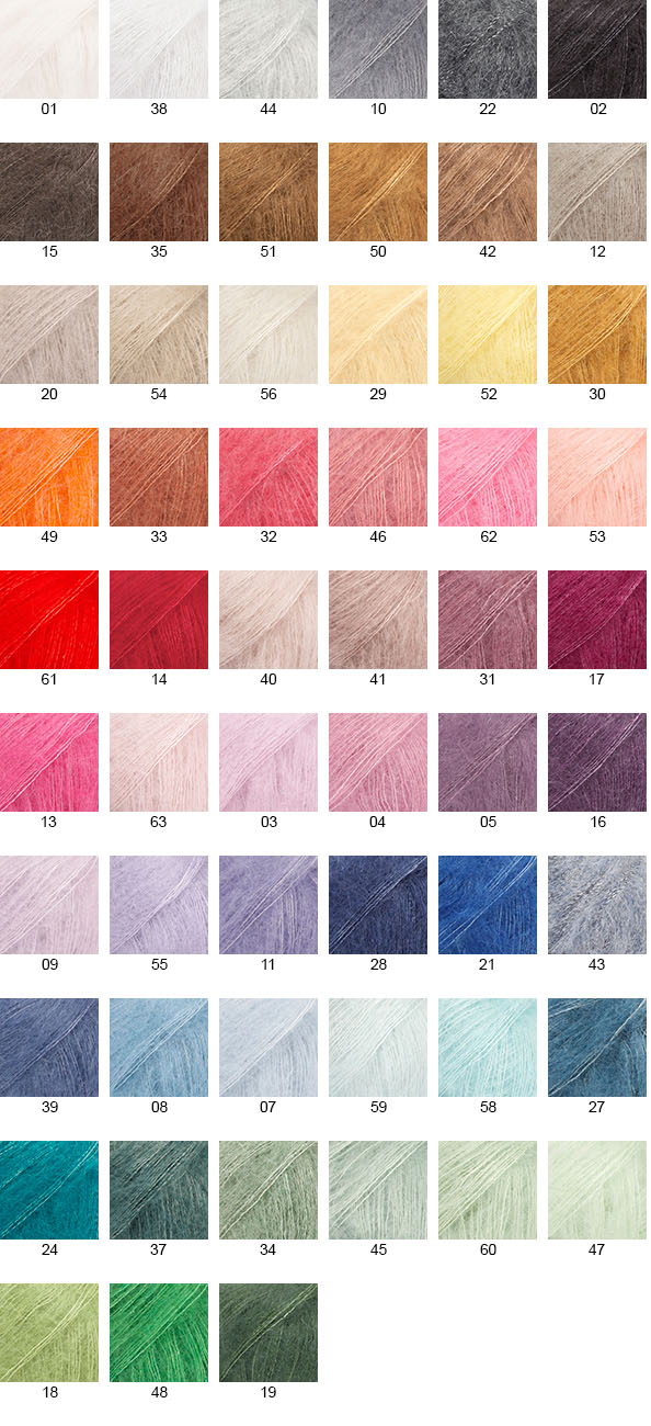 75% SuperKid mohair, 25% Silk Kid-Silk is a light and luxurious quality, with a soft colour range. This yarn gives a garment a sophisticated look, whether it's used alone or together with other qualities. It is perfect for smaller garments such as shawls, shoulder warmers and feminine tops. For free