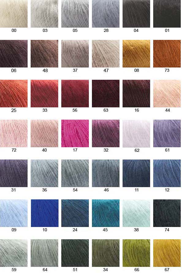 60% superkid mohair, 40% silk Premia is the ultimate in luxury. Ultra light and loftly, this lace weight mohair could be knit alone for a cloud-like garment, or doubled with another yarn to give it the soft mohair effect and silk sheen. Hand wash. |