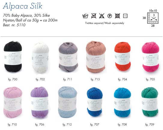 70% Baby Alpaca, 30% Silk Alpaca Silk is a soft durable yarn suitable for all ages. Excellent yardage and fun colours gives this yarn great versatility. Handwash only. |