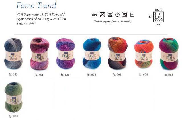 75% Superwash wool, 25% Polyamid Fame Trend is a great sock yarn that is machine washable. Available in varigated colours that change gradually. One ball will definitely make a pair of socks! |