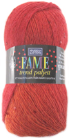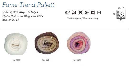 55% wool, 38% acrylic, 7% sequins Fame Trend Paljett is just like the popular Fame Trend, with the addition of sequins. They are fun and classy! |
