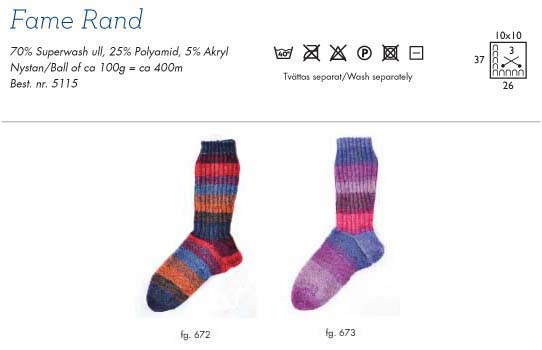 70% Superwash wool, 25% Polyamid, 5% Acrylic Fame Rand is a fun spin on a great sock yarn. A dark thread wraps around a colourful yarn that stripes in bold, solid stripes. A fun one to knit with, and 6 great colours to chose from. Machine washable. |